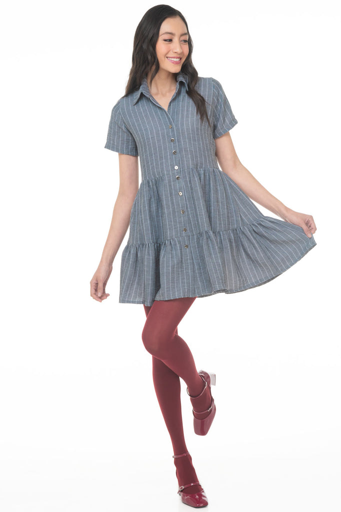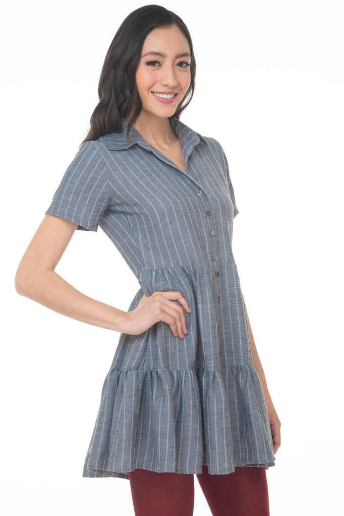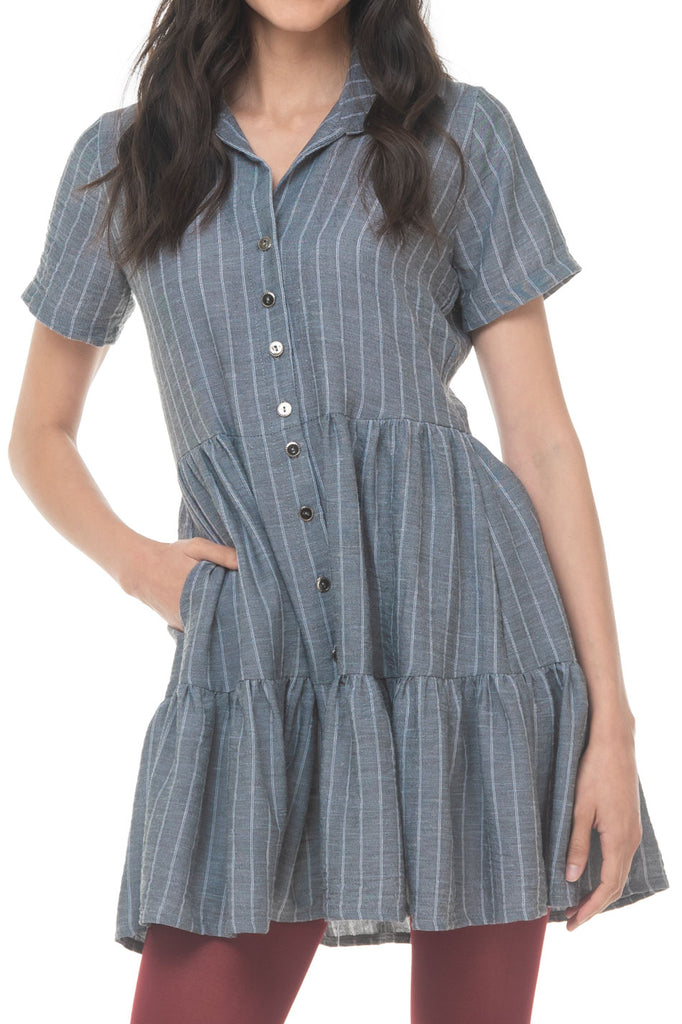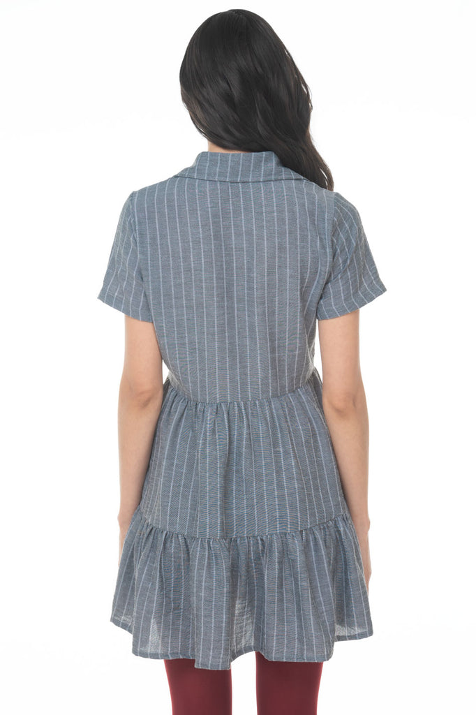 S10629:2509:Vestido Camisero Linea A Corto A Rayas Con Olan Manga Corta