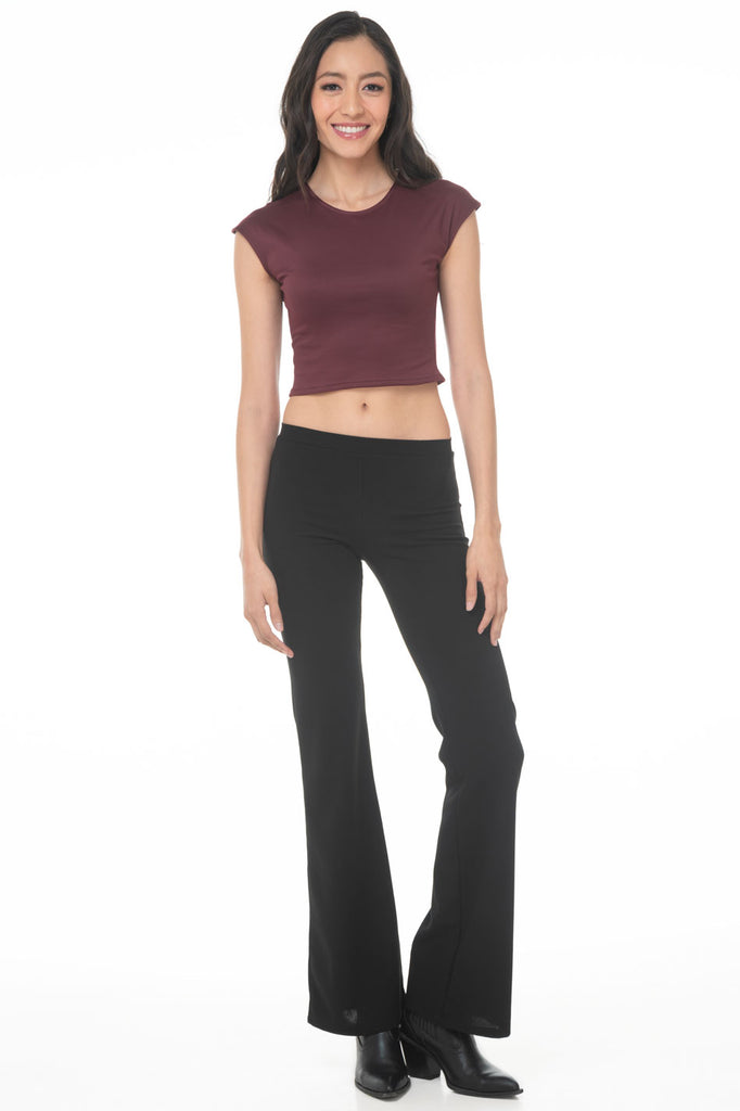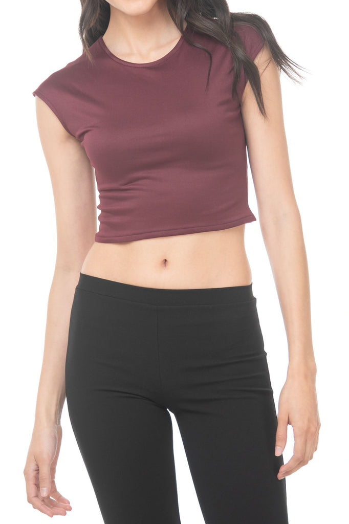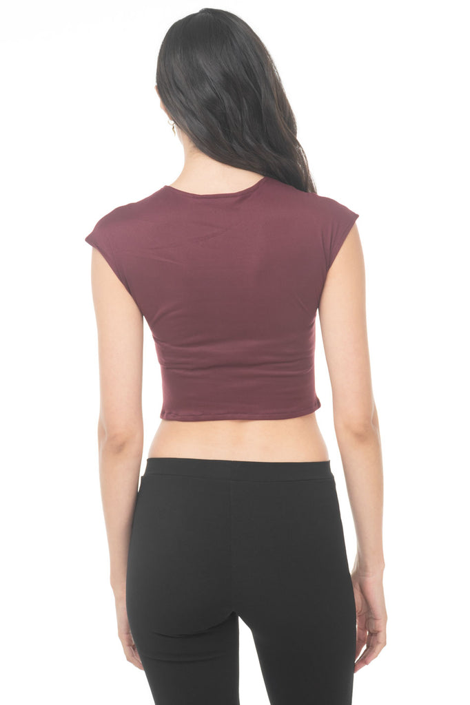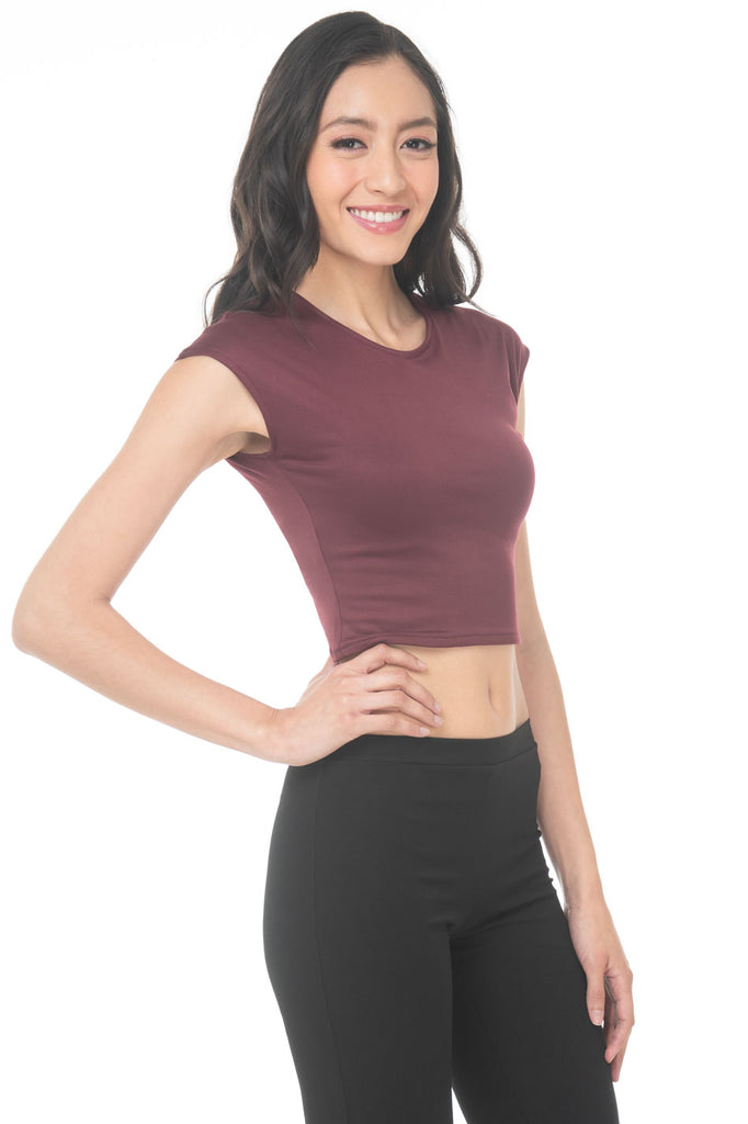 Top liso corto, casual, de cuello redondo y sin mangas en tono vino.