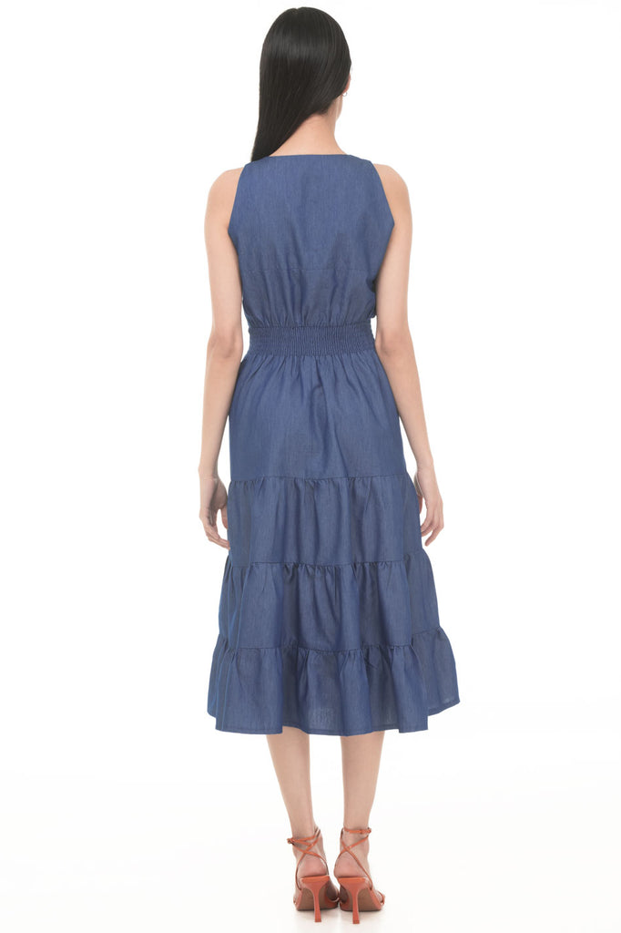 JC1175:2602:Vestido Denim Semicircular Midi Con Olanes Sin Mangas