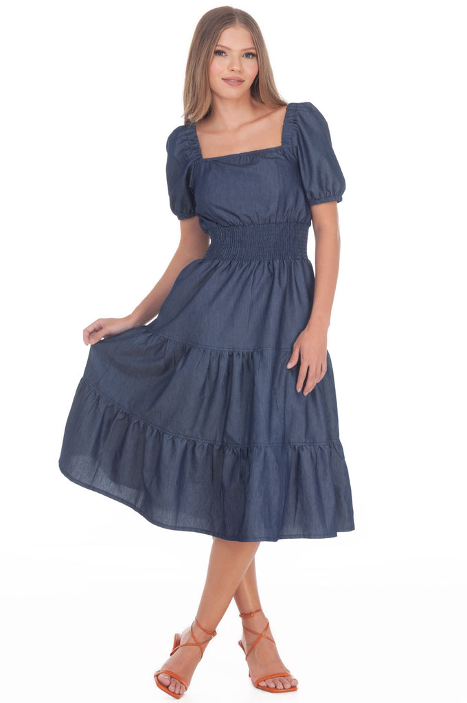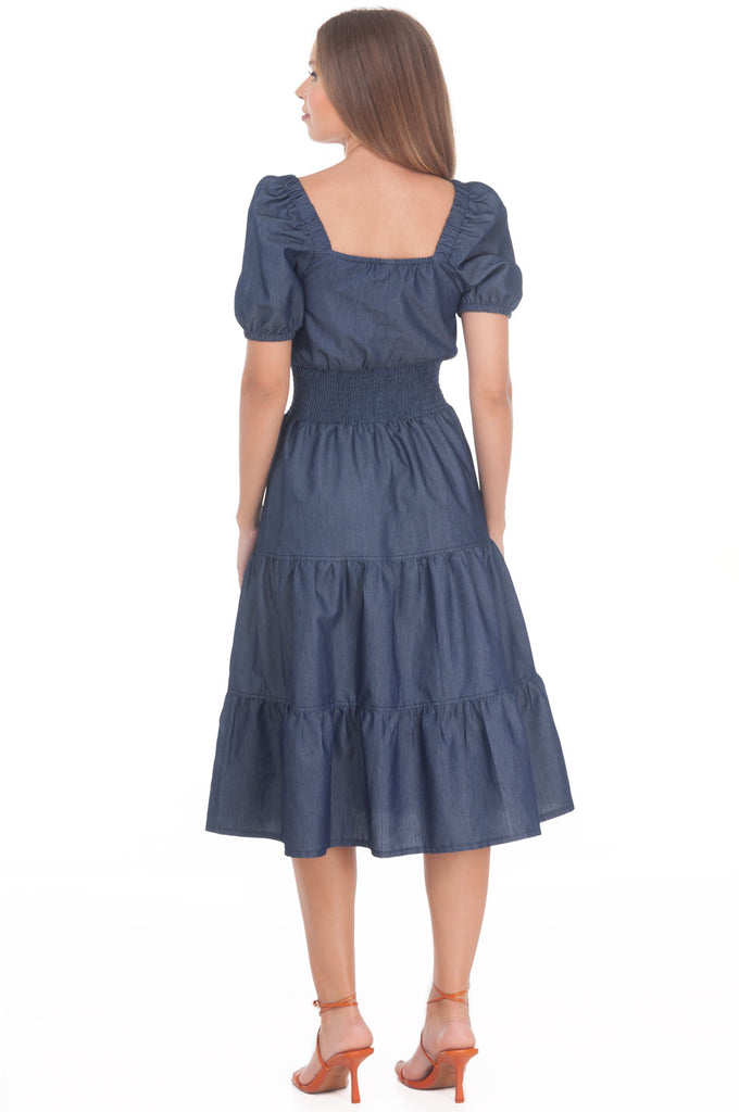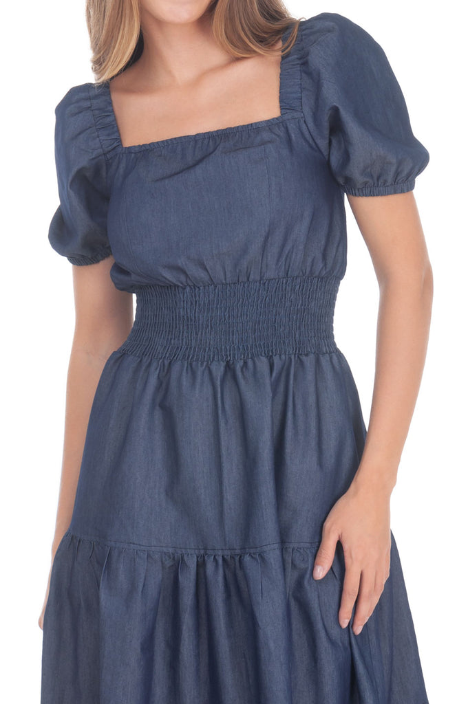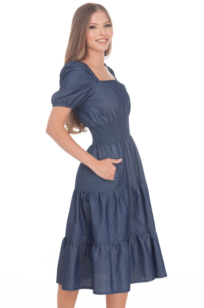 L00316:2504:Vestido Semicircular Liso Denim Midi Con Smock Manga Corta