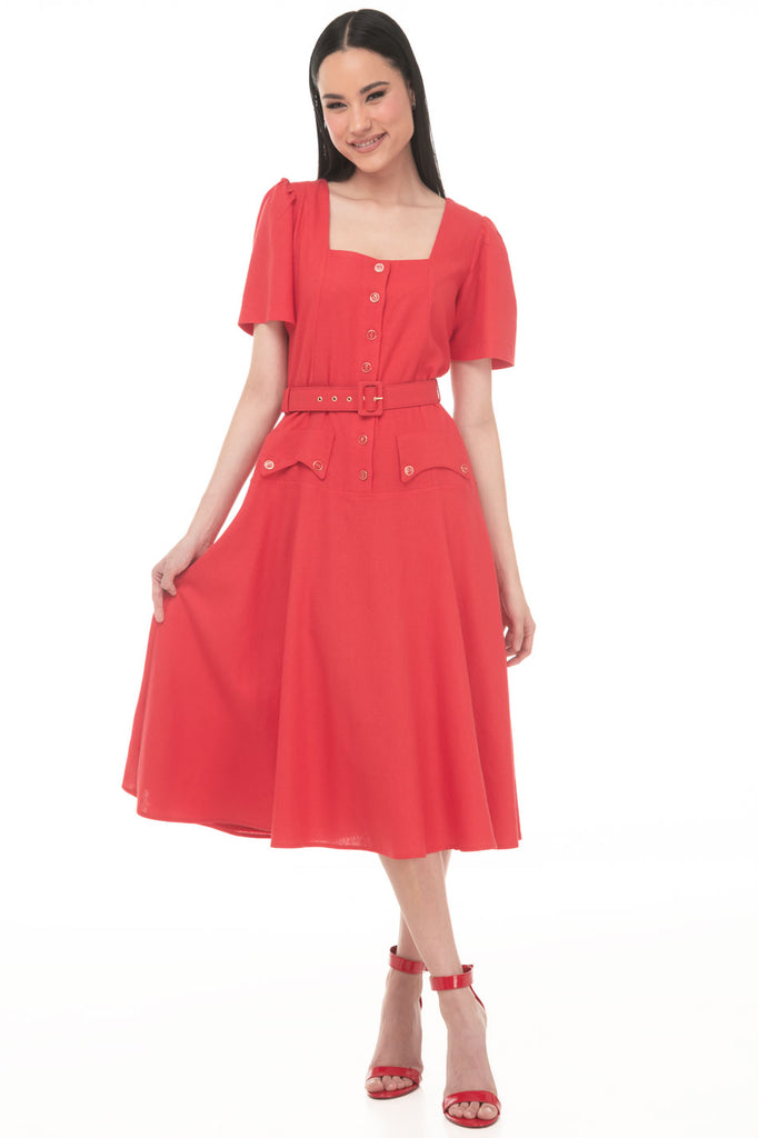 L00375:2602:Vestido Linea A Liso Midi Escote Cuadrado Manga Corta