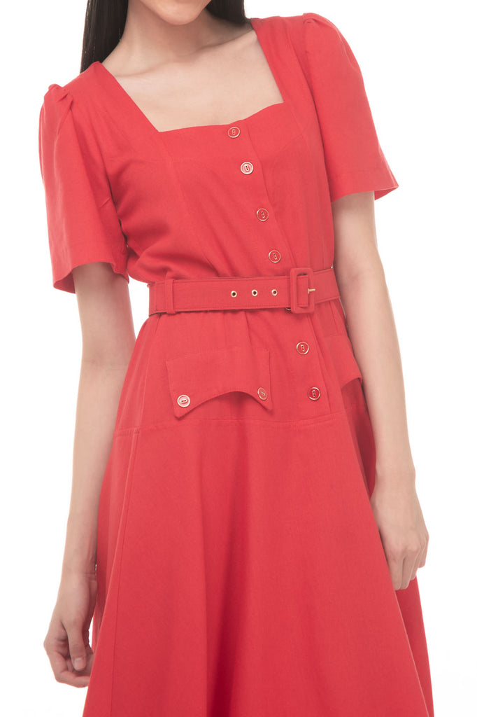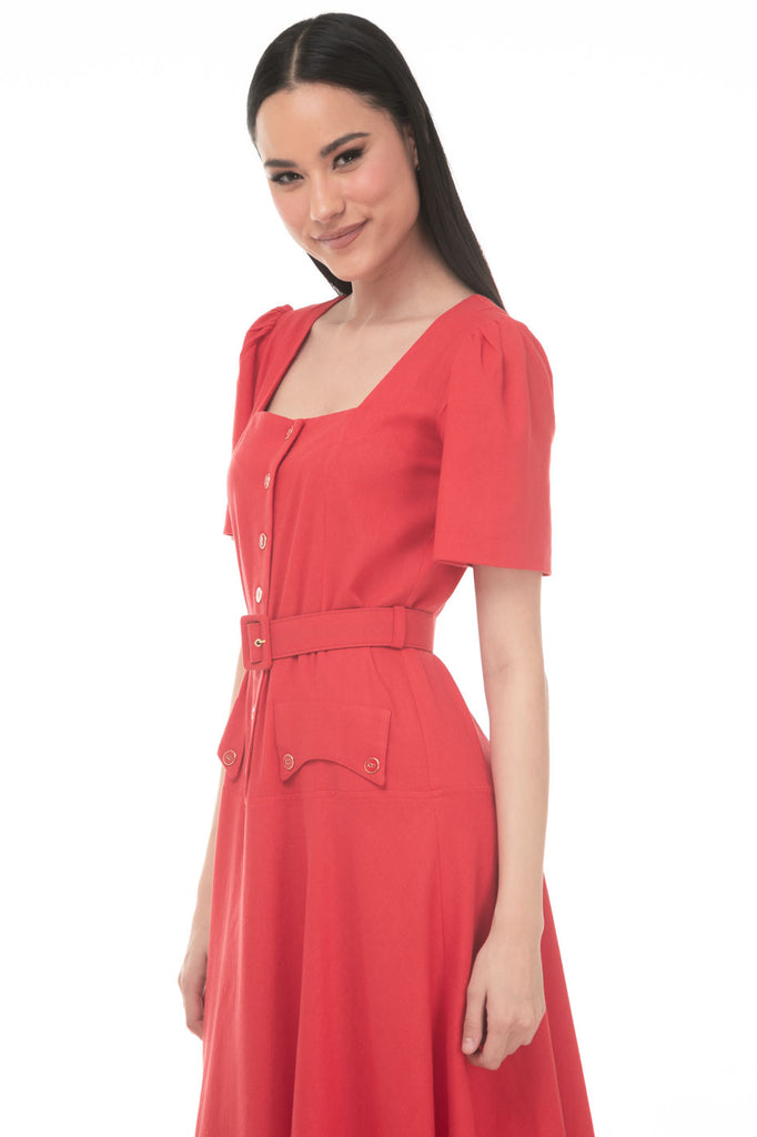 Vestido Linea A Liso Midi Escote Cuadrado Manga Corta