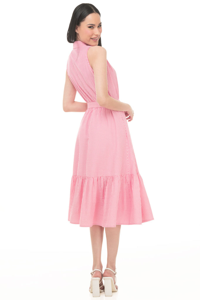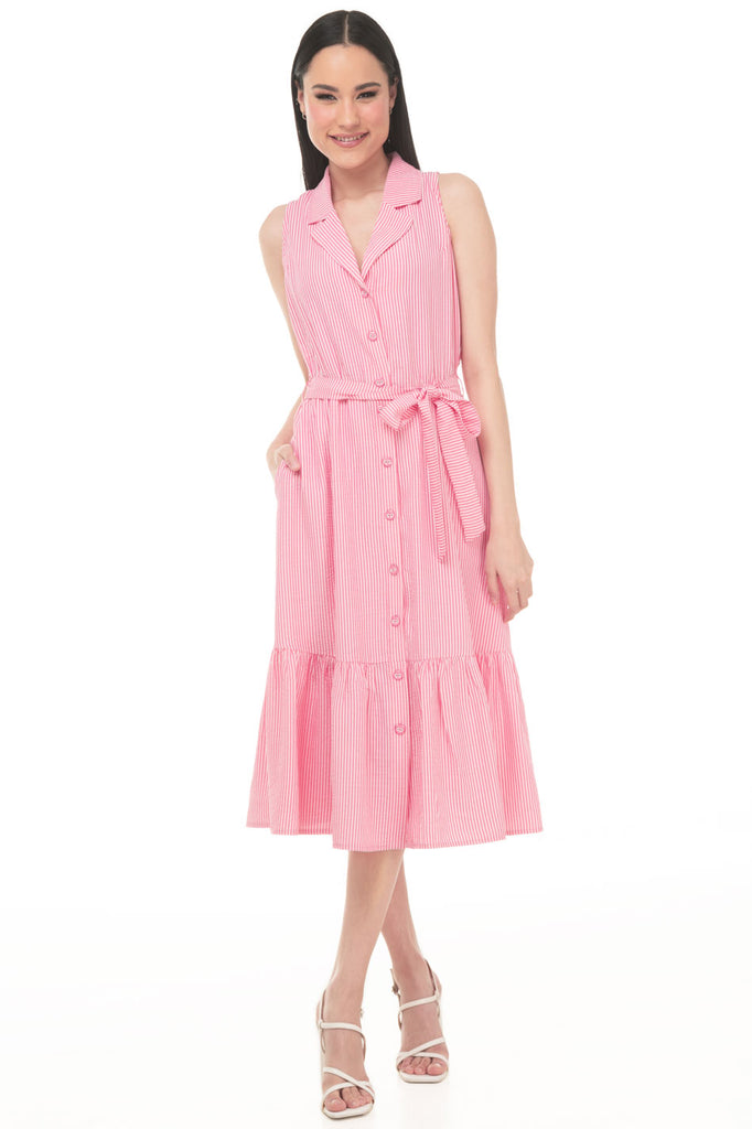 L00376:2602:Vestido Camisero Semicircular Liso Midi Con Olan Y Cinturon