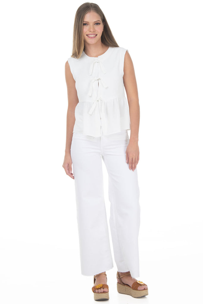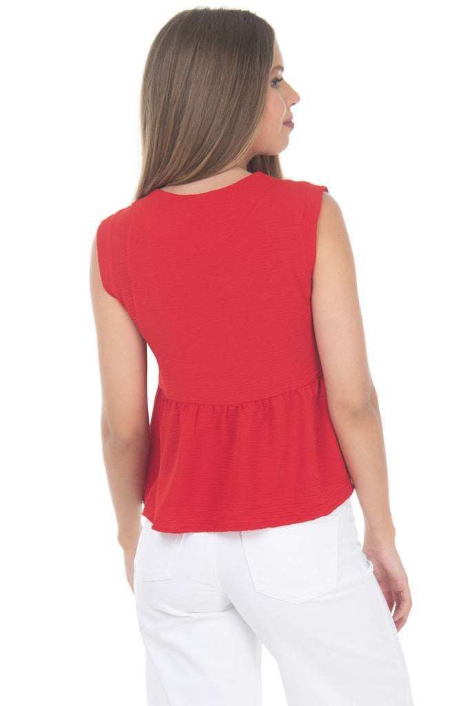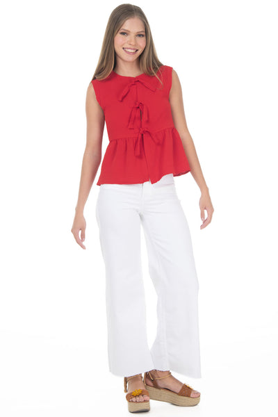 Blusa lisa, sin mangas, a la cadera, con cintas de amarre, color blanco y rojo